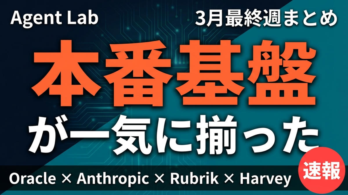 Oracle・Anthropic・Rubrik・Harvey。2026年3月最終週、AIエージェント本番運用に必要な記憶・遠隔操作・ガバナンス基盤が同時に揃った。81%がバラバラ運用の現実も。